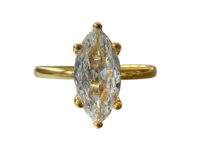 This dainty ring adds a touch of elegance with a marquise shaped manmade stone. It is made from sterling silver and plated in gold. It is a size 7.